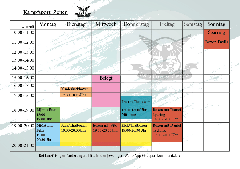 Entdecke unsere vielfältige Kampfsportwelt! Mit Boxen, Kick- und Thaiboxen, Ringen , Jiu-Jitsu (BJJ) und MMA ( Mixed Martial Arts ) bieten wir vier Kontaktsportdisziplinen zu einem günstigen Preis. Perfektioniere deine Techniken, steigere deine Fitness und stärke deinen Geist. Unsere professionellen Trainer stehen dir sechs Tage die Woche während der Kurse zur Seite. Darüber hinaus kannst du den Kampfsportbereich während der Studioöffnungszeiten jederzeit für dich nutzen. Erlebe die Faszination des Kampfsports und werde Teil unserer dynamischen Gemeinschaft. Starte noch heute deine Kampfsportreise bei Joe's Exclusiv Fitness Studio Kirchheim Teck